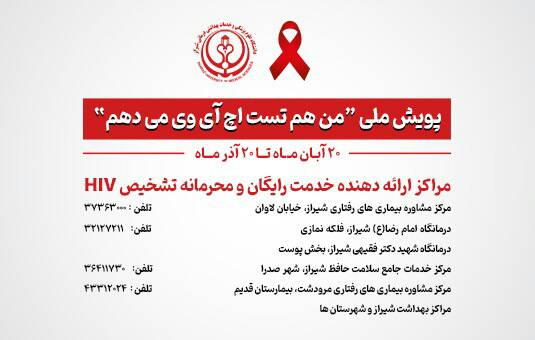 ����لازم به ذکر است تمامی خدمات مربوط به آزمایش، مشاوره و درمان این بیماری رایگان بوده و به صورت کاملاً محرمانه در "پایگاه مشاوره بیماریهای رفتاری شبکه بهداشت و درمان خرامه"، انجام می‌شود که افراد متقاضی جهت انجام تست می‌توانند به آنجا مراجعه کنند. ���� شبکه بهداشت و درمان شهرستان خرامه،واحد پیشگیری از بیماری های واگیر